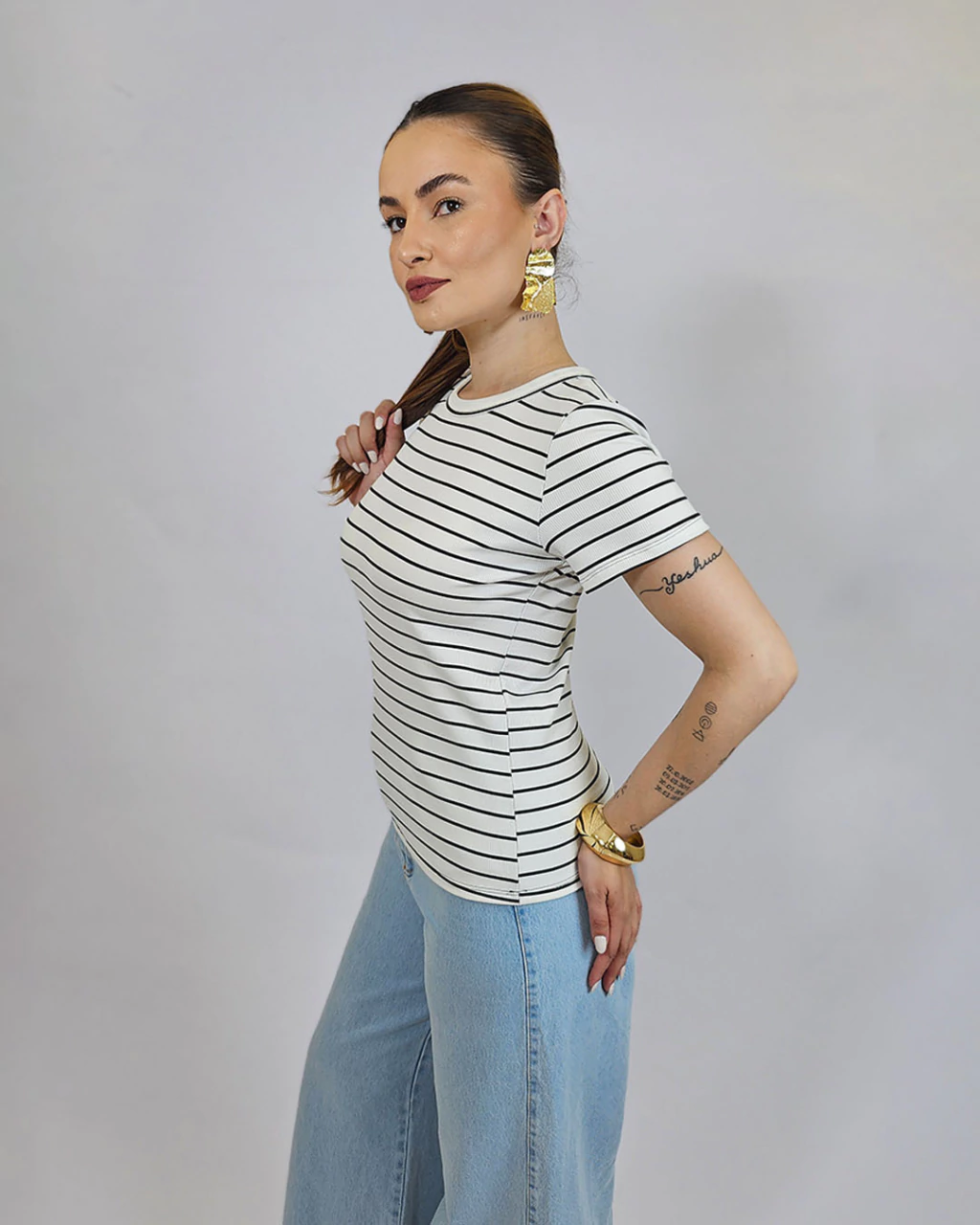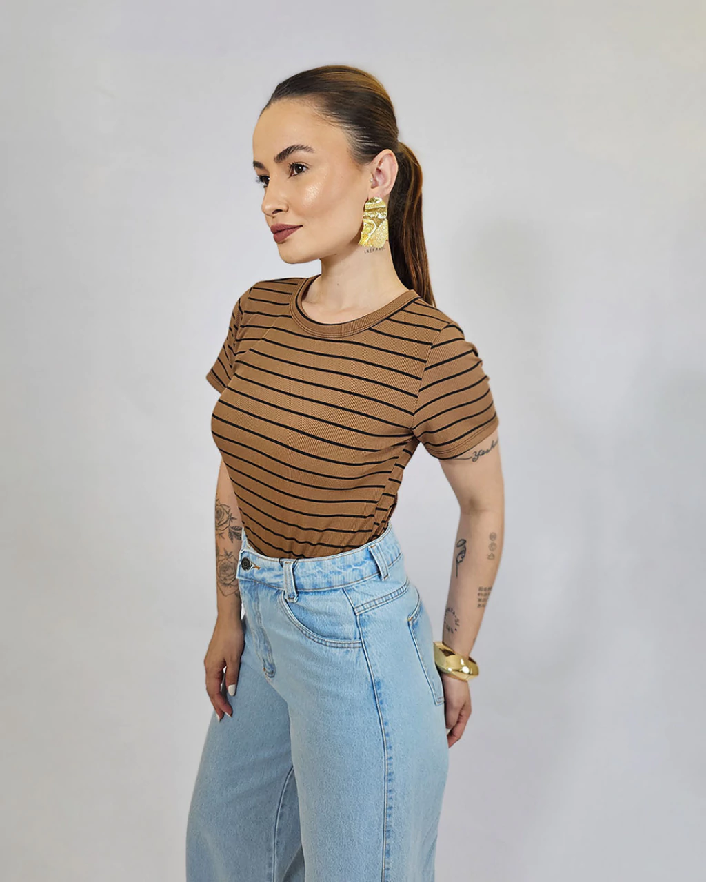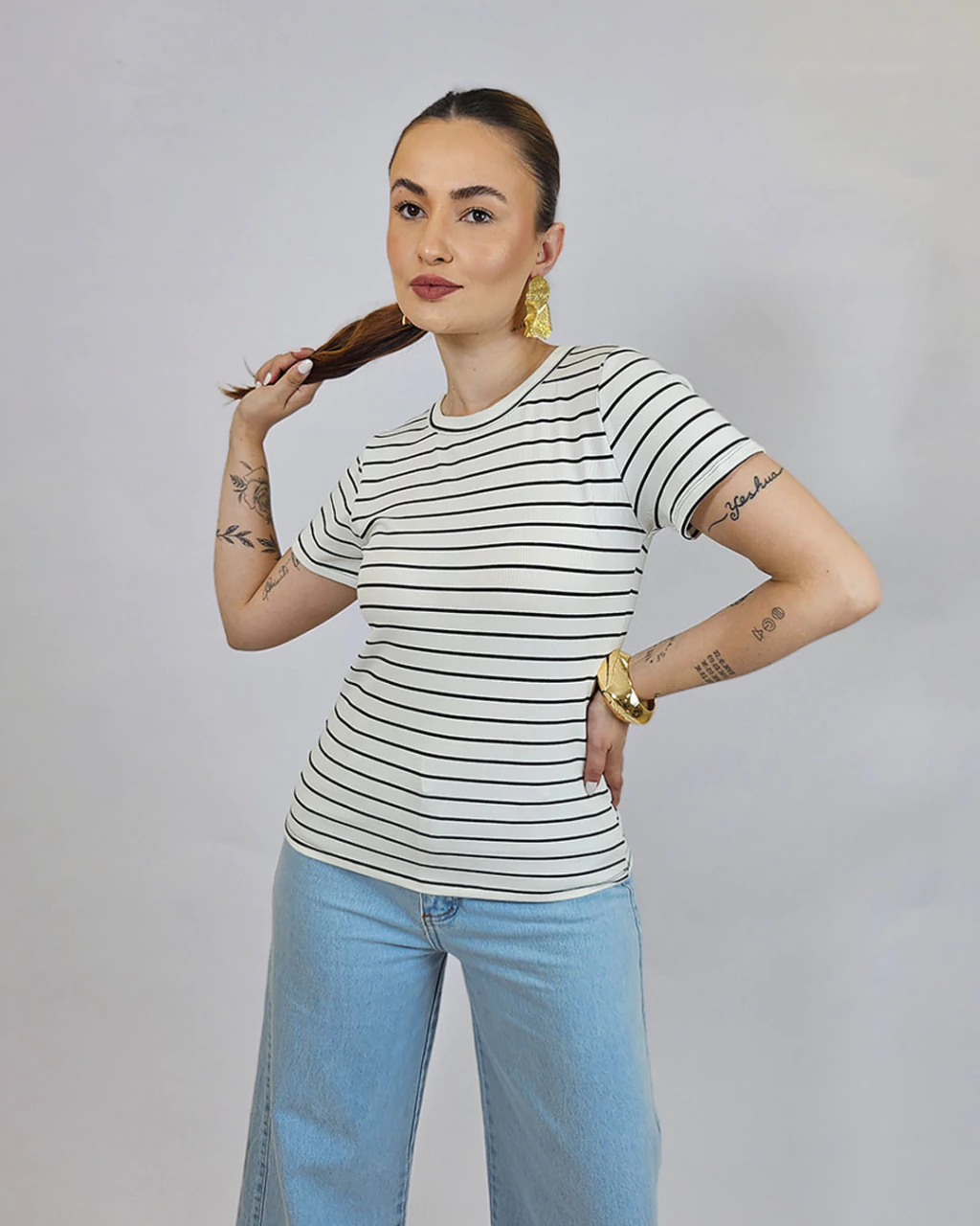 Versátil e indispensável, essa blusa transita com facilidade do look casual ao mais elaborado, tornando-se uma escolha certeira para o seu guarda-roupa. Seu tecido agradável ao toque garante conforto durante todo o dia, enquanto o design listrado adiciona personalidade ao visual.